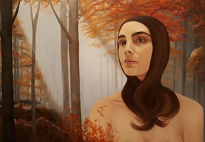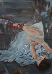 2016Een schilderij uit meerdere lagen opgebouwd; Een man, vaag in de achtergrond Een vrouw, mysterieus gekleed Bloemen en takken verspreid over het beeld Gevangen in een transparante glaceerlaag.