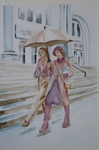 2018De winterkou is in het land, maar goed dat deze dame zich warm heeft aangekleed. Geschilderd tegen een donkere achtergond met diverse (transparante) paarse bloemen.