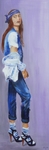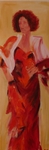 2009Een warm en kleurrijk smal doek, zwierig geschilderd. Deze dame is duidelijk op weg naar een feestje.. Het gezicht is gedetailleerd, de jurk juist lekker wild met een spatel geschilderd.