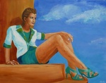 2010Het is Lente! Met een bloem in het haar en en bloem op de bank geniet deze dame van het leven. Een lieflijk mooi tafereel. Een geweldig drieluik in combinatie met de 'Groene Hortensia' en de 'Vetplant'. Maar losstaand natuurlijk ook geweldig.