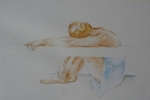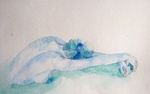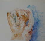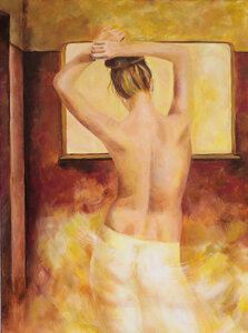 2010Een jonge naakte vrouw vanaf de rugzijde gezien. De eerder gemaakte aquarel is nu als uitgangspunt genomen. Ik heb geprobeerd om mijn perfectionisme los te laten en lekker zwierig te schilderen.