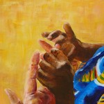 2010Een Nederlandse vrouw en een Ghanees kindje spelen en bewonderen elkaars handen. Ik heb dit werk voor een vriendin gemaakt naar een van haar foto's uit de periode dat zij vrijwilligerswerk deed in Ghana.