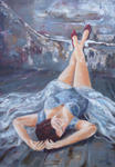 2010Een naakte vrouw, bewegend als een ballerina buigt zich elegant voorover. Kleurgebruik is anders dan anders: namelijk groen/blauw.