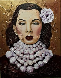 2019Meisje met parelketting tegen een gouden achtergrond geschilderd met acryl. In de achtergrond heb ik diverse structuren aangebracht, die in het portret doorwerken.