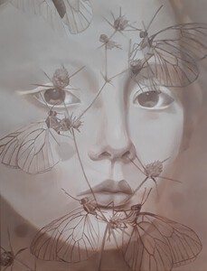 2022Een sfeervol, teder schilderij van een teer gezichtje gecombineerd met transparante vlinders.